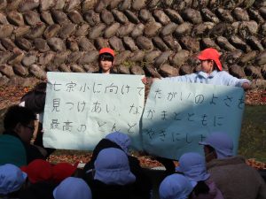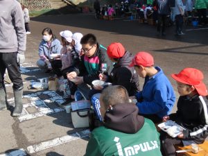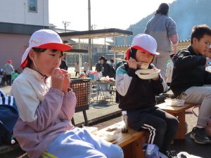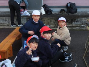 お待ちかねの食事会では,焼いてもらったお餅に持ってきた醤油やきなこ,のりで味付けをし,おいしそうにほおばる姿がとても印象的でした。するめやさつまいも,マシュマロもお好みで食べることができてとても満足そうでした。食事会後は,神渕小の子が考えてくれた遊びを各学年に分かれて楽しむことができました。心も体もそしておなかも満足できた時間となりました。地域のボランティアの皆様,保護者の皆様に心より感謝申し上げます。