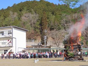 1月16日(金)神渕小学校で『どんど焼き』があり,上麻生小も招待を受け,一緒に参加させてもらいました。各学級の代表者が新年の目標を力強く語ったり,6年生児童がやぐらに点火するのを見守ったりするなど,どんど焼きという伝統行事を味わうことができました。激しく燃えるやぐらの火を眺めながらお願い事をする子もいました。『令和8年も上麻生小・神渕小の子どもたち全員が健康で元気に過ごせますように!』